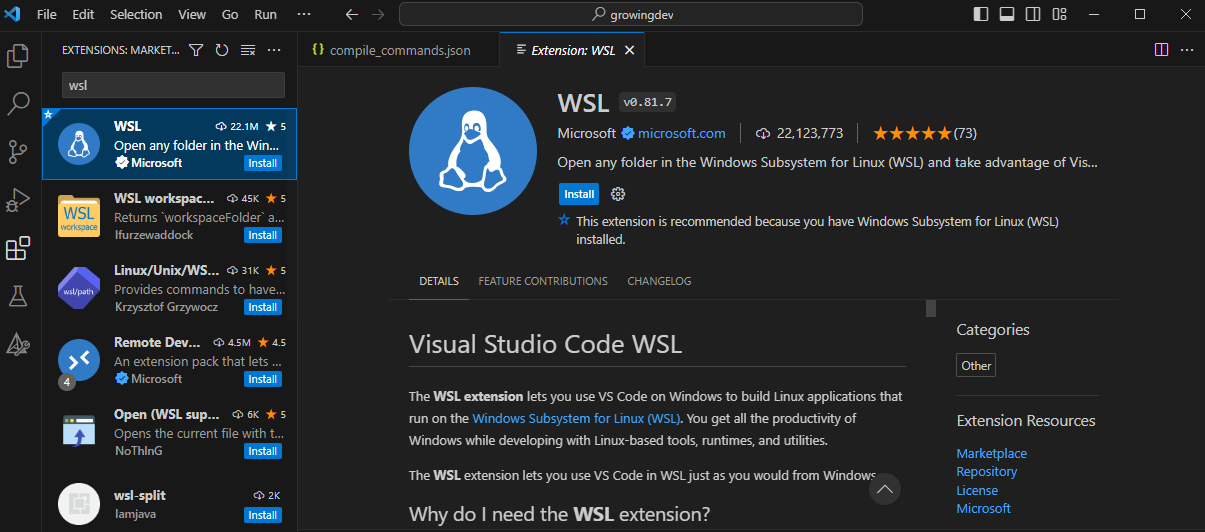 우선 VS Code를 실행해서 Extension에 WSL을 검색해서 아래와 같은 확장을 설치해 줍니다.