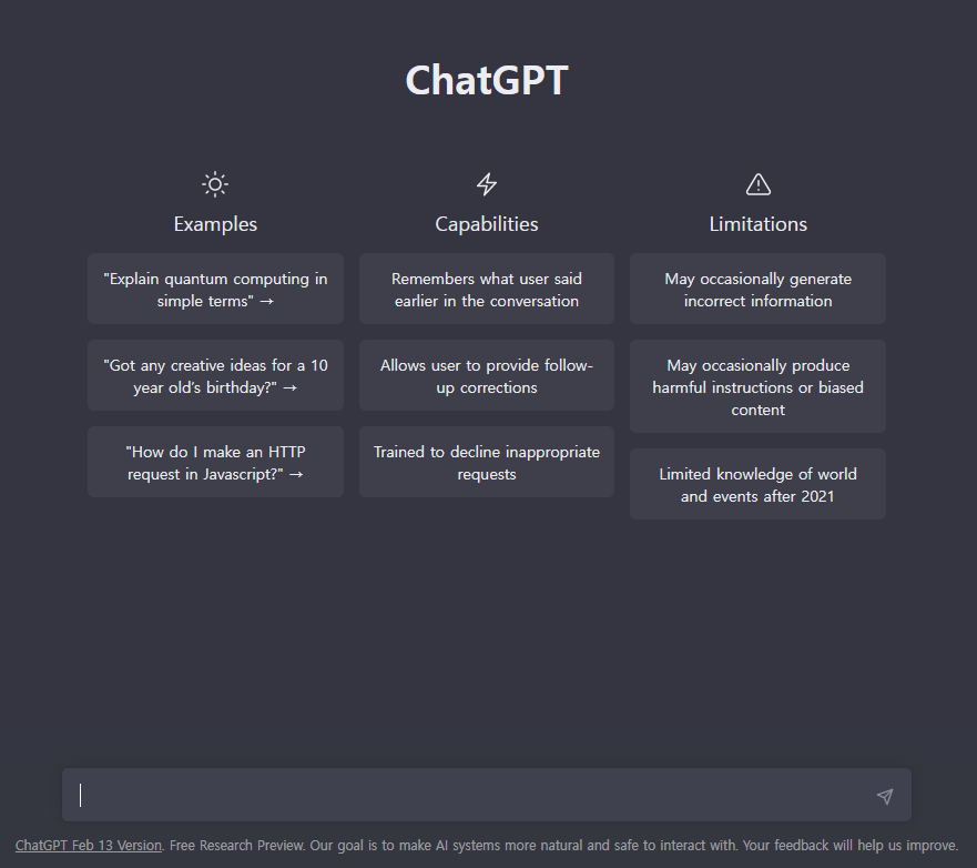 ChatGPT는 openAI라는 곳에서 만든 대화형 인공지능 AI기반 챗봇이다.