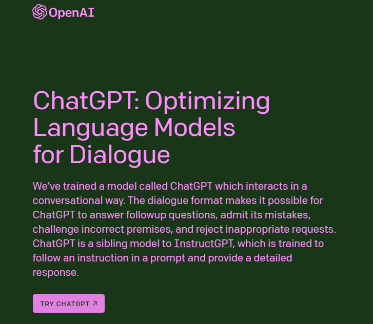 We’ve trained a model called ChatGPT which interacts in a conversational way. The dialogue format makes it possible for ChatGPT to answer followup questions, admit its mistakes, challenge incorrect premises, and reject inappropriate requests. ChatGPT is