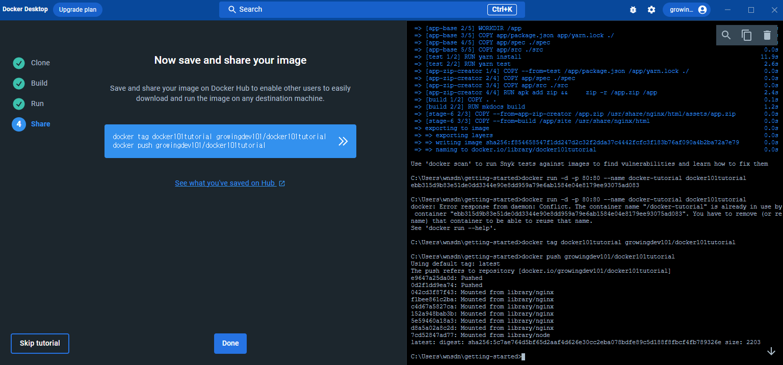그리고 도커 데스크탑에서 도커 허브와 연동하고 튜토리얼을 진행해 본다. 튜토리얼 과정은 굳이 일일이 설명하지 않아도 너무 친절하게 잘 동작하였고 Clone -> Build -> Run -> Share의 과정을 거쳐서 최종적으로 도커 허브에 이미지를 push 하는 것까지 해보았다.