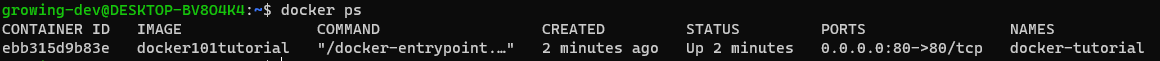 도커가 잘 실행되고 있는지 WSL으로 들어가서 확인해보았다. docker ps를 입력하면 방금 전에 튜토리얼에서 진행해서 실행되고 있는 도커 컨테이너와 도커 이미지 정보가 나온다.