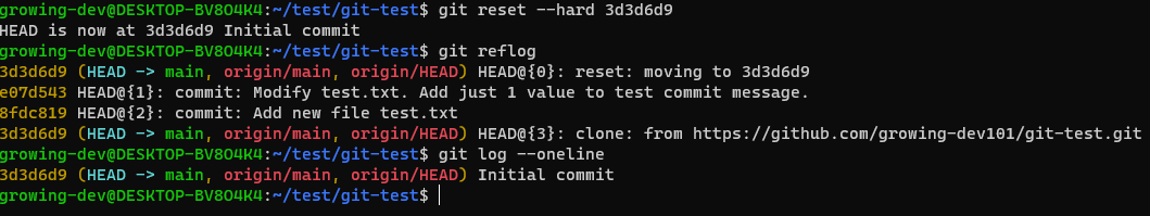 다시 git reflog를 해보면, log가 하나 더 쌓이고, 쌓인 로그의 상태가 기존 3d3d6d9와 동일함을 알 수 있다.