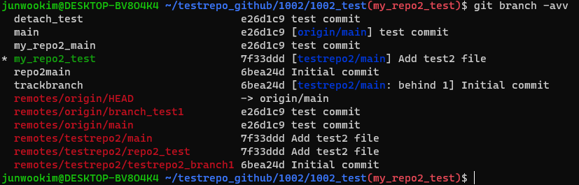 아래와 같이 my_repo2_test 라는 브랜치를 가리키고 있고 터미널 창에 빨간색으로 my_repo2_test가 항상 붙어있다.