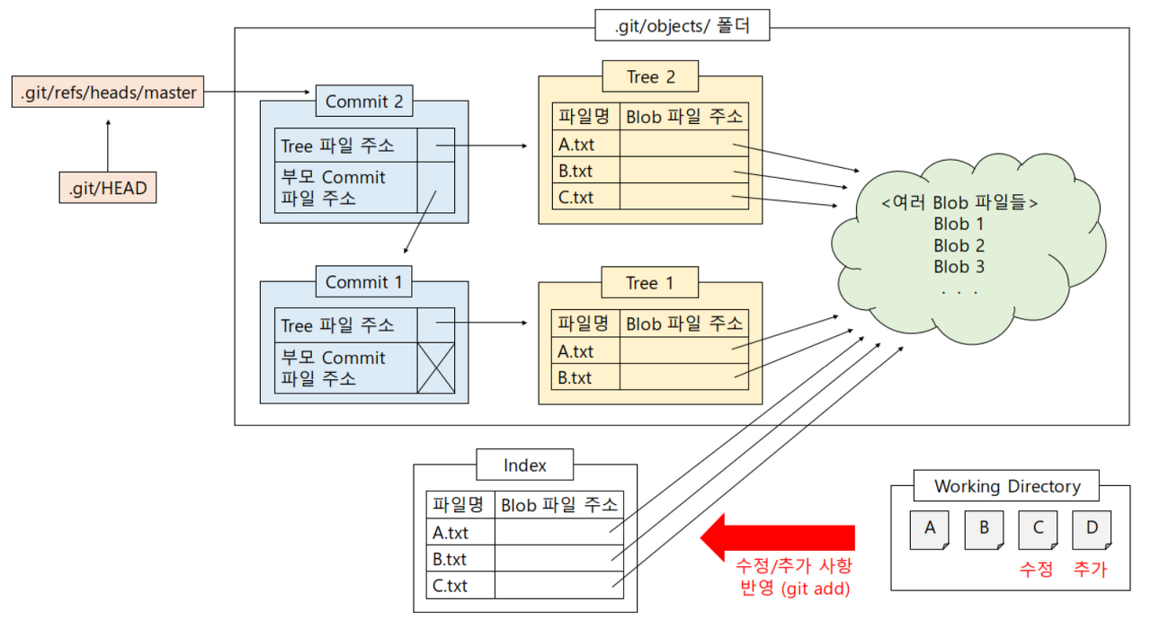 | Tree 파일 | 커밋 시점의 파일들 각각에 대해 그 파일명과 해당 파일의 내용을 담고 있는 Blob 파일의 주소(이름)가 기록된다. 위에서 설명했던 인덱스 파일(.git/index)과 성격이 유사하다. |