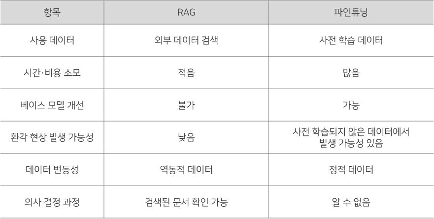 [표 1] RAG와 파인튜닝 비교 (출처: Skelter Labs, 재구성: 이글루코퍼레이션)