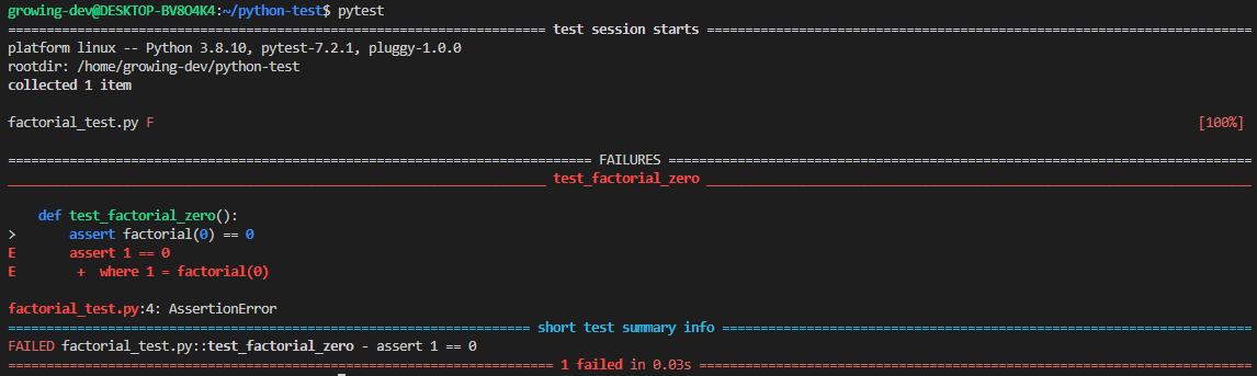 실행하려면 지정했던 디렉터리에서 pytest를 입력하기만 하면 된다. 아래와 같이 factorial_test.py 가 발견되고 실행되었으며 실패했다는 것을 확인할 수 있다.