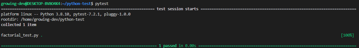 코드를 아래와 같이 정상적으로 수정하였다. factorial(0)의 결과는 1이 되는 것이 현재 구현사항이므로 이렇게 수정하면 아래와 같이 pass 되는 것을 확인할 수 있다. 직관적으로 빨간색으로 실패를, 초록색으로 성공을 표시해 주어서 쉽게 확인할 수 있다.