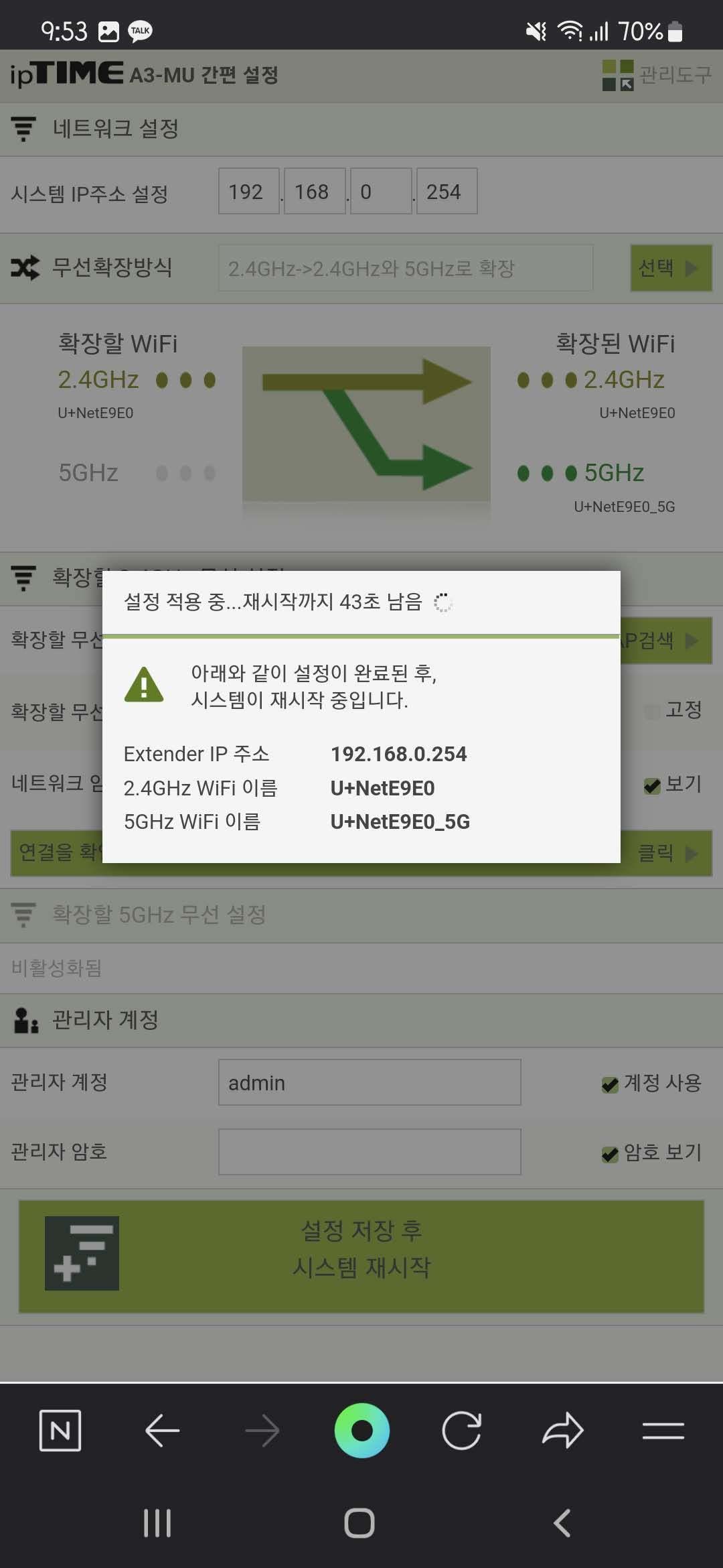 6. 설정 저장 후 재시작 버튼을 누르고 약 40초 정도 설정이 완료되기를 기다린다.