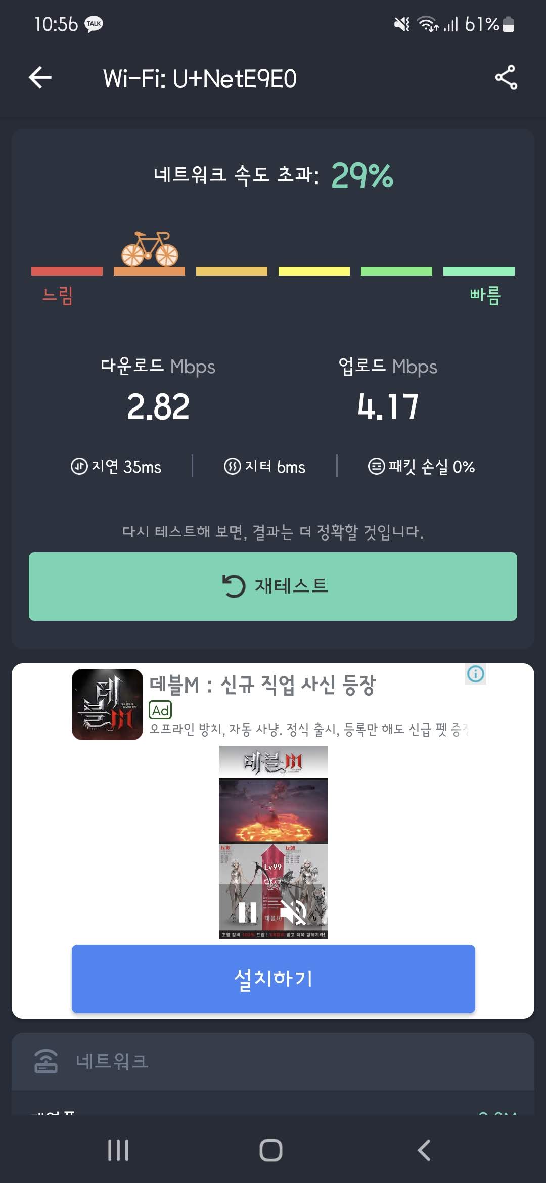 먼저 기존 사각지대에서의 2.4G Wi-fi의 속도입니다. 다운 2.82Mbps, 업 4.17 Mbps 정도로 확인됩니다.