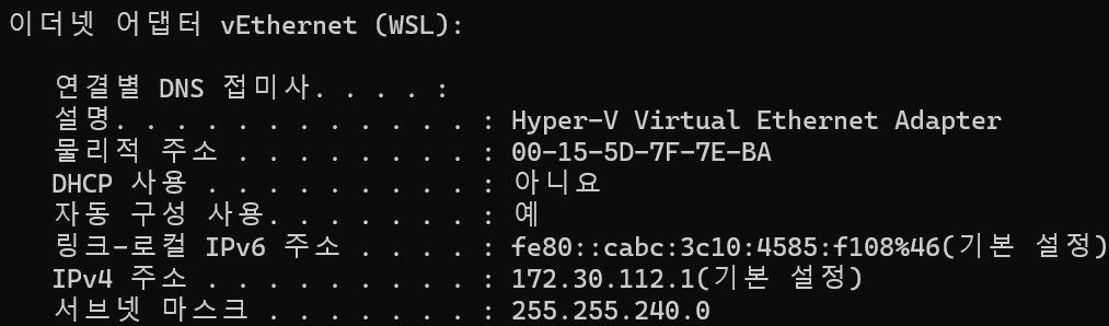 172.30.112.1 이 할당된 주소이며 이는 윈도 터미널 상에서 ipconfig로 확인하였을 때 나오는 값과 일치하는 것을 알 수 있습니다.